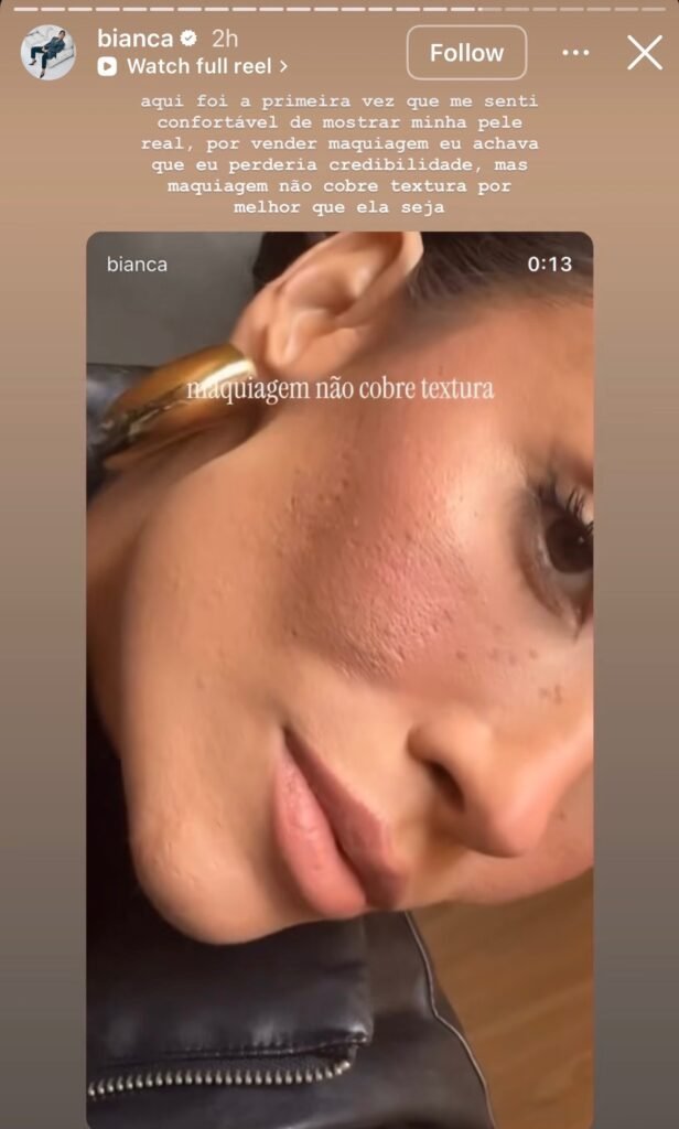 Ao mostrar sua pele real, Bianca reforçou uma mensagem que tem ganhado força nos últimos anos: a maquiagem pode valorizar a aparência, mas não elimina completamente as características naturais da pele.