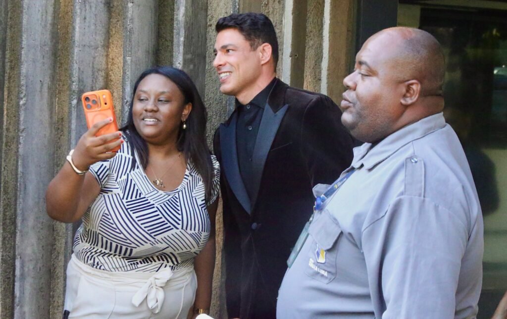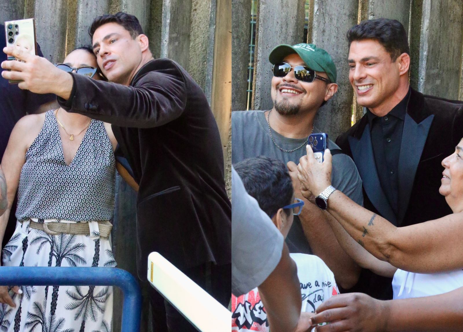 Cauã Reymond posa com fãs ao chegar ao Projac para premiação