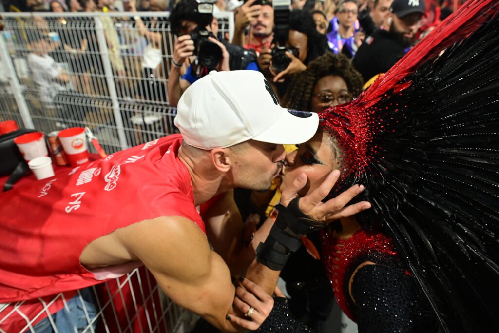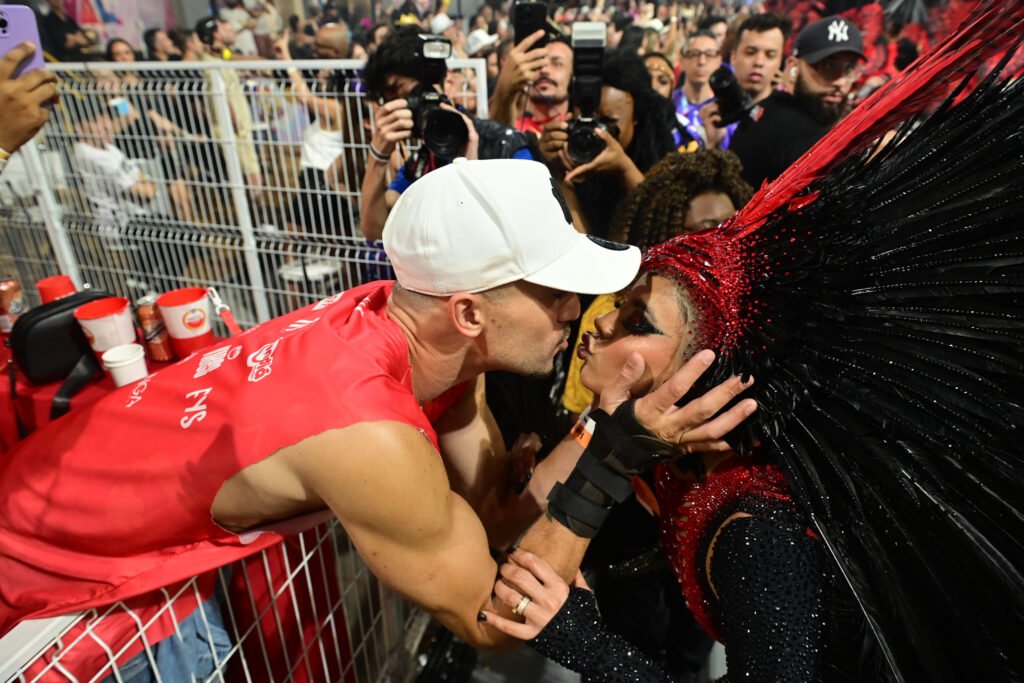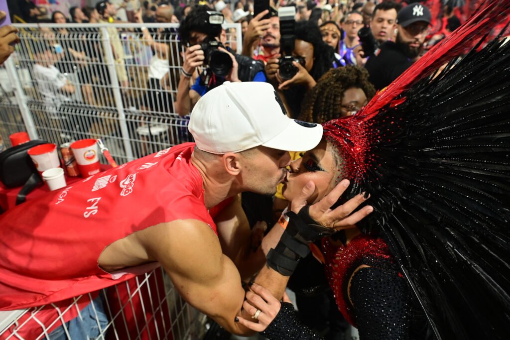 A cena aconteceu enquanto Lexa atravessava o sambódromo com carisma e segurança, esbanjando simpatia e sintonia com a comunidade da escola. A artista, que tem uma forte ligação com o Carnaval e costuma se entregar intensamente aos compromissos carnavalescos, foi surpreendida pelo gesto carinhoso. O marido se aproximou, trocou algumas palavras rápidas e, em seguida, selou o momento com um beijo que arrancou aplausos e gritos da arquibancada.