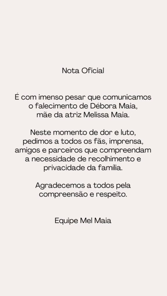 Mesmo assim, a morte da mãe atingiu profundamente Mel. A atriz divulgou uma nota oficial expressando seu luto e pedindo respeito ao momento extremamente sensível que ela e a família atravessam.