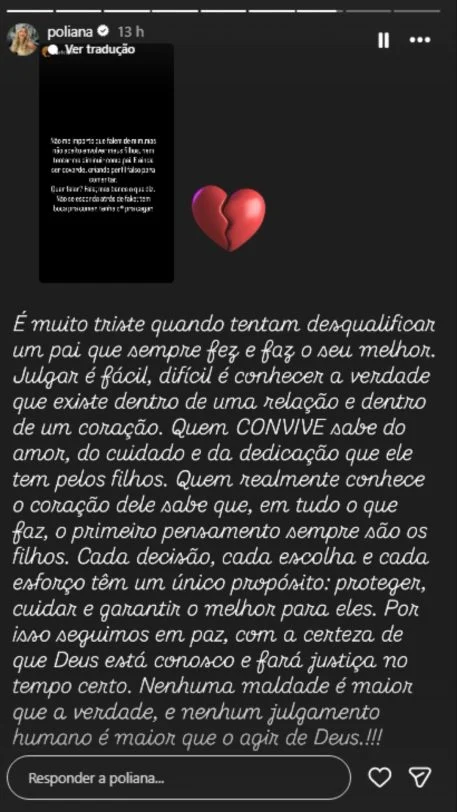 “É muito triste quando tentam desqualificar um pai que sempre fez e faz o seu melhor. Julgar é fácil. Difícil é conhecer a verdade que existe dentro de uma relação e dentro de um coração”, escreveu Poliana, demonstrando indignação com os ataques virtuais direcionados ao filho.