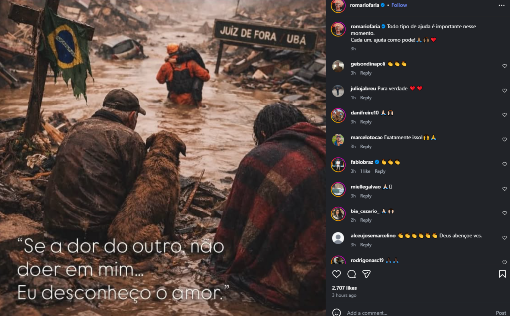 Em meio à lama e ao luto, o apelo é claro: transformar comoção em ação. Para Romário, ajudar não é gesto pontual, mas compromisso permanente. E, diante de uma das piores tragédias climáticas recentes em Minas Gerais, sua mensagem ecoa como convite direto à solidariedade ativa, aquela que sai da tela e chega até quem mais precisa.