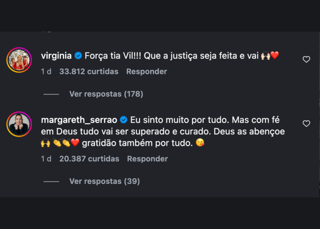 A rede de solidariedade também contou com mensagens de outras integrantes da família. Margareth Serrão, mãe de Virginia, escreveu palavras de conforto, destacando a importância da fé e da esperança durante períodos difíceis. Em seu comentário, ela desejou força para a família e afirmou acreditar que o tempo e a justiça trarão respostas.
