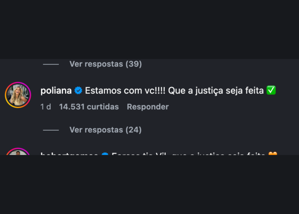 A influenciadora Virginia Fonseca foi uma das primeiras a comentar a publicação e demonstrar apoio. Em uma mensagem breve, mas carregada de empatia, ela escreveu: “Força, tia Vil! Que a Justiça seja feita.” A declaração emocionou Vilmeci, que respondeu agradecendo o carinho e o suporte recebido. Para ela, receber apoio em um momento tão difícil faz toda a diferença.
