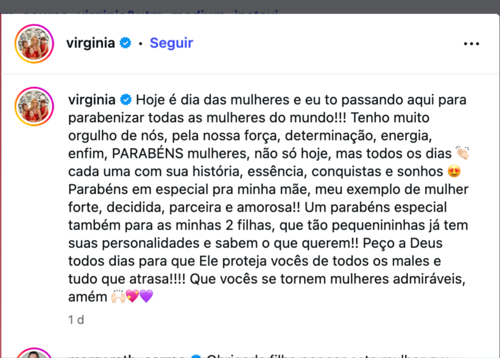 A homenagem publicada neste Dia Internacional da Mulher reforça justamente essa conexão entre gerações de mulheres da mesma família. Ao celebrar a mãe e as filhas, Virginia destacou a importância do apoio, da inspiração e do amor entre mulheres, valores que, segundo ela, ajudam a fortalecer cada história.